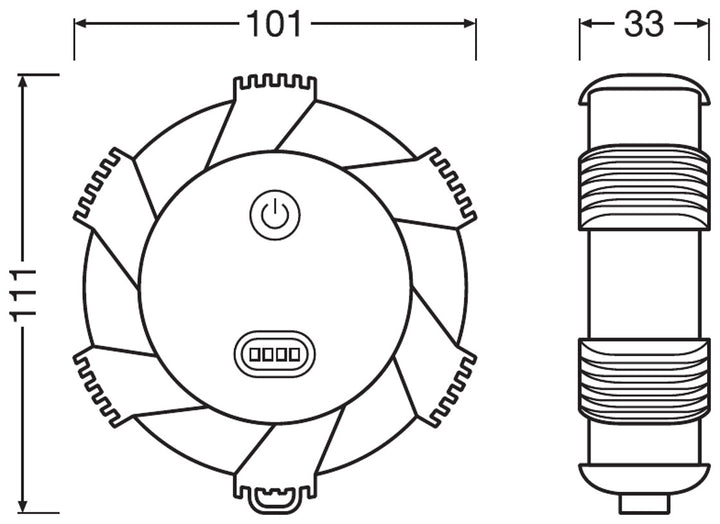 Budite spremni s OSRAM svjetlima za upozorenje i sigurnost. LEDguardian ROAD FLARE je kompaktno LED svjetlo za upozorenje za razne cestovne situacije i manje preglede vozila. Žuto LED svjetlo za upozorenje koje se rotira od 360 stupnjeva vidljivo je iz daljine i može pružiti ključne informacije o opasnim situacijama u hitnim slučajevima. 16 visokokvalitetnih, dugotrajnih LED dioda nudi tri različita načina rada: žuto svjetlo za upozorenje koje se rotira od 360 stupnjeva, stalno žuto svjetlo i bijelu svjetiljku. Nadalje, LEDguardian ROAD FLARE ima protukliznu površinu otpornu na prljavštinu, praktičnu kuku za pričvršćivanje te je toliko izdržljivo i otporno da ga čak može preći i automobil bez gubitka performansi.** LEDguardian ROAD FLARE testiran je i odobren u našem certificiranom laboratoriju za simulaciju okoliša za ekstremne vanjske utjecaje poput vode, prašine i udaraca od padova. S klasama zaštite IP54 i IK07, LEDguardian ROAD FLARE otporan je na vodu, prašinu i udarce. Zahvaljujući trima uključenim AAA baterijama, svjetlo za upozorenje spremno je za trenutnu upotrebu.